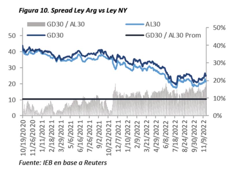 El spread por legislación, comprando el Global 2030 con el Bonar 2030 se ubica en 17,5%, muy próximo a los máximos de 18,5% que supo tocar recientemente.