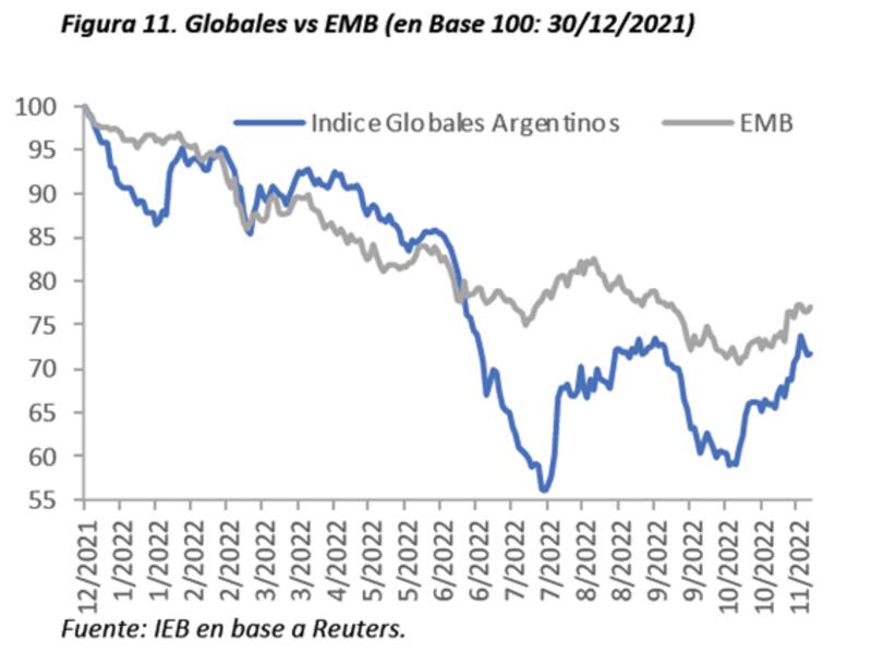 En el tramo medio, la deuda también exhibe ganancias abultadas. El Global 2035 y el Global 2038 suben 17,5% y 15,6% en noviembre y tiene también su mejor mes desde septiembre de 2020.