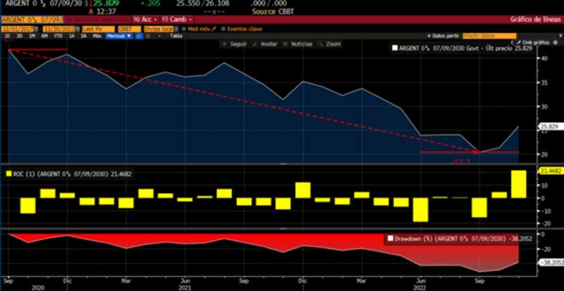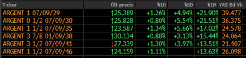 A su vez, teniendo en cuenta el rally actual, el resto de la curva de Globales (2030, 2035, 2038, 2041 y 2046) muestra una pérdida acumulada de entre 38% y 30% desde que salieron a cotizar tras el canje de deuda.