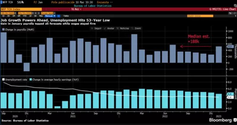 La contratación en EE.UU aumentó en enero y la tasa de desempleo cayó a un mínimo de 53 años, lo que muestra un mercado laboral inesperadamente dinámico que probablemente reforzará la determinación de la Reserva Federal de extender su serie de aumentos de las tasas de interés.