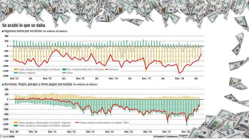 La salida neta de u$s 317 millones se originó en pagos netos a emisoras de tarjetas por u$s 214 millones, egresos netos de aerolíneas y otros transportistas de pasajeros por u$s 52 millones, pagos netos de operadores turísticos por us$ 65 millones, que estuvieron levemente compensados por ventas netas de billetes de no residentes por u$s 14 millones.