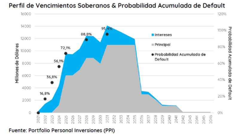 Desde Portfolio Personal Inversiones aclararon que "la escasa confianza de que Argentina pueda juntar los recursos o volver al mercado de capitales para afrontar los pagos a partir de 2023, castiga la probabilidad del flujo de fondos más allá de esta fecha. De hecho, el mercado descuenta con una probabilidad acumulada de 72,1% que el país cometa otro evento de crédito en los próximos 4 años. La teoría se impuso: la restructuración a secas no alcanza para volver sostenible la deuda", dijeron desde PPI.