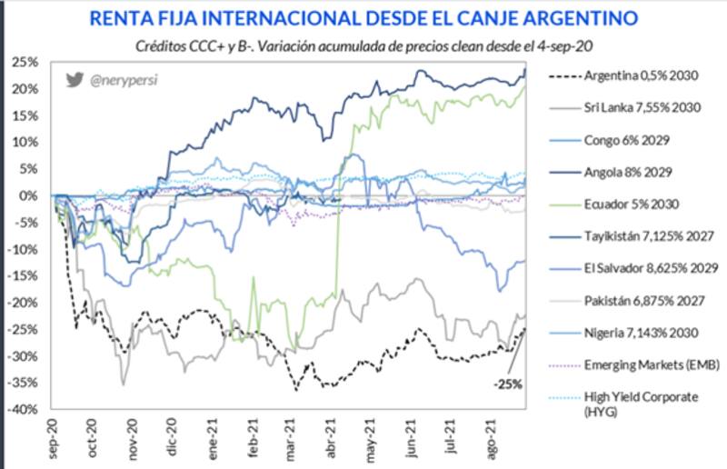 En cambio, los bonos de Ecuador, los cuales tuvieron un canje muy parecido a los de Argentina, con la salvedad que el país latinoamericano si acordó con el FMI y tuvo un resultado electoral promercado, tuvo un rally del 20%, similar a los bonos de Angola que subieron 23 por ciento.