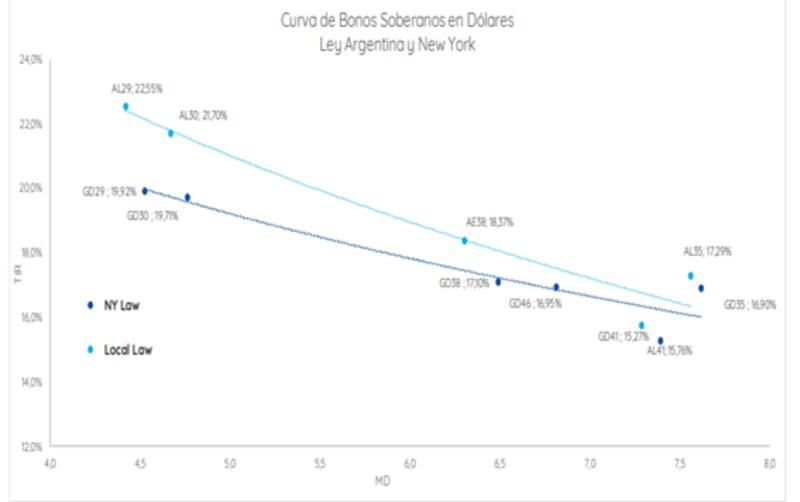 Ambas curvas están invertidas, por lo que el mercado le asigna mayores riesgos crediticios en el corto plazo, síntoma de clara de confianza de los bonistas para con la deuda local.
