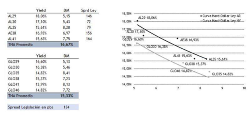 Por su parte, Juan Pablo Vera, jefe de operaciones de Tavelli y Compañía, estimó: "El comportamiento de las curvas dolarizadas al cierre de la semana pasada, a priori muestran un panorama más delicado establecido por un aumento del spread por legislación y nuevos máximos de rendimientos para el tramo corto. Tomando precios de cierre del viernes por tipo de cambio implícito, notamos un nuevo máximo en el rendimiento del AL29, en niveles de 18,05% y con una curva más inclinada aún. El spread por legislación se incrementó a 134 puntos básicos en promedio, aumentando diferencial en todos los puntos. Sin embargo, en los tramos más largos esta diferencia es de aproximadamente 150 puntos básicos. En el caso que el escenario se espiralice hacia lo negativo, la protección de la convexidad en los bonos largos como el GD38 y baja paridades en los bonos a 2035 y 2041 podrían hacer la diferencia".