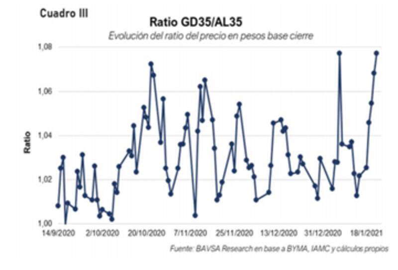 "Creemos que esta zona de precios representa un nivel adecuado para tomar ganancias del trade. Si bien la legislación extranjera bajo un comportamiento racional del mercado debería valer más que la legislación local, creemos que este nivel de casi 8% de apreciación del GD35 con respecto al AL35 es muy elevado, por lo que el trade planteado es el cambio de GD35 por AL35", afirmaron desde BAVSA.