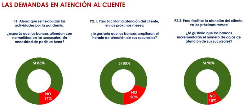 Además, un 80% de los clientes encuestados dijo esperar que las entidades amplíen su horario para facilitar la atención en las sucursales. Y en ese mismo sentido 9 de cada 10 consultados dijeron que les gustaría que su banco incremente el número de cajas para la atención.