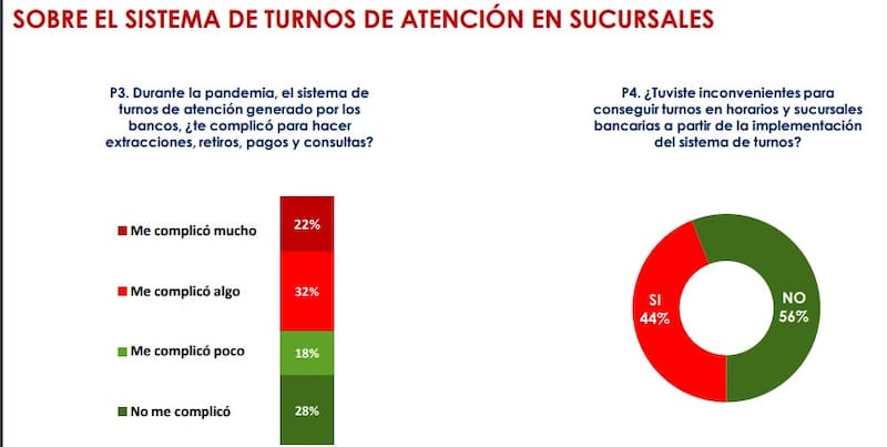 Sobre ese punto, se destacó el hecho que el 54% de los participantes manifestó haber tenido complicaciones a la hora de realizar extracciones, pagos y consultas. También que el 44% dijo haber tenido inconvenientes para obtener turnos para la atención en sucursales.