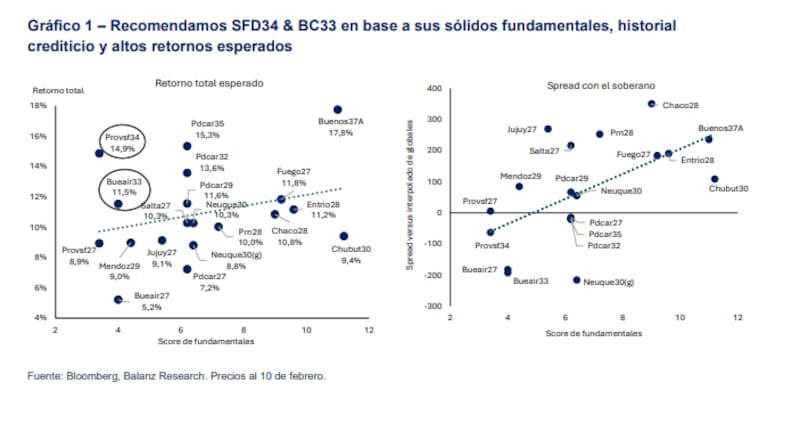 Con ese marco, la recomendación concreta se concentra en dos papeles. El SFD34 (Santa Fe 2034) y BC33 (CABA 2033). Las estimaciones proyectan para el primero un retorno total esperado cercano al 15%, impulsado por un fuerte upside por compresión de spreads, mientras que el bono de la Ciudad ofrece un retorno total estimado en torno al 11%.