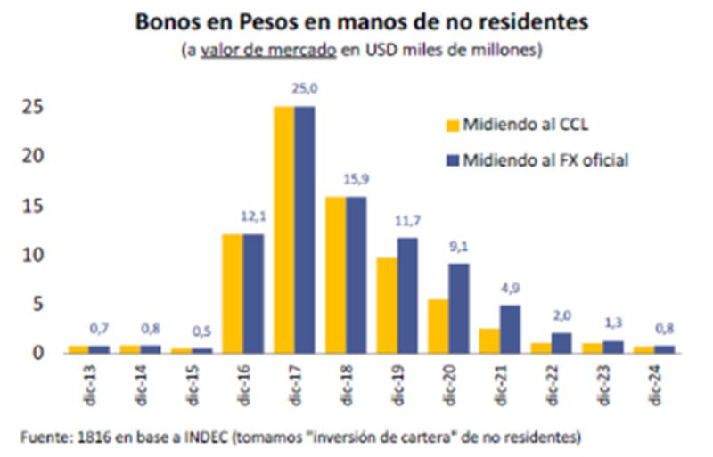 El promedio de exposición de no residentes desde 2015 a la fecha es de u$s 9000 millones, aunque hoy es de u$s 800 millones, uno de los valores más bajos en las últimas décadas.En el marco de la liberación de los controles cambiarios, el Gobierno habilitó el ingreso de fondos del exterior con la exigencia de permanencia de seis meses. El mercado espera una estabilidad cambiaria y los bonos en pesos toman más protagonismo.