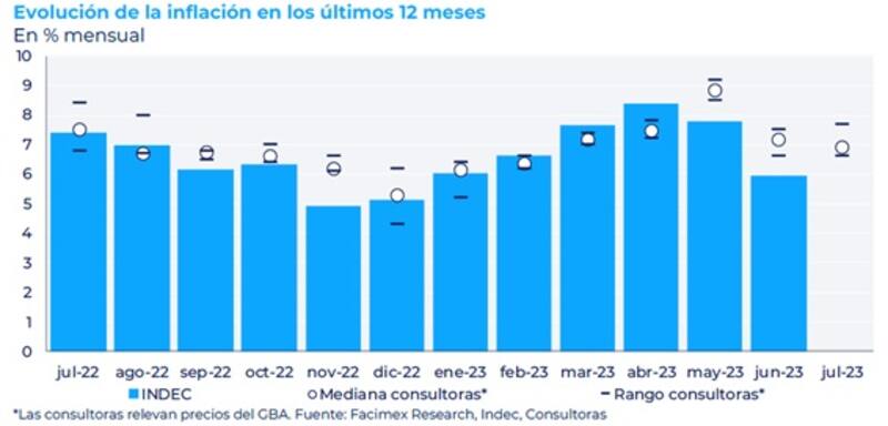 "Todas las mediciones de las consultoras que seguimos se ubicaron por encima del 6,0% mensual reportado por el Indec para junio. Las mediciones privadas sugieren que la inflación de julio habría sido superior a la de junio y estaría en torno al 6,5% y 7,0% mensual, interrumpiendo la desaceleración observada en mayo y junio", comentaron desde Facimex Valores.
