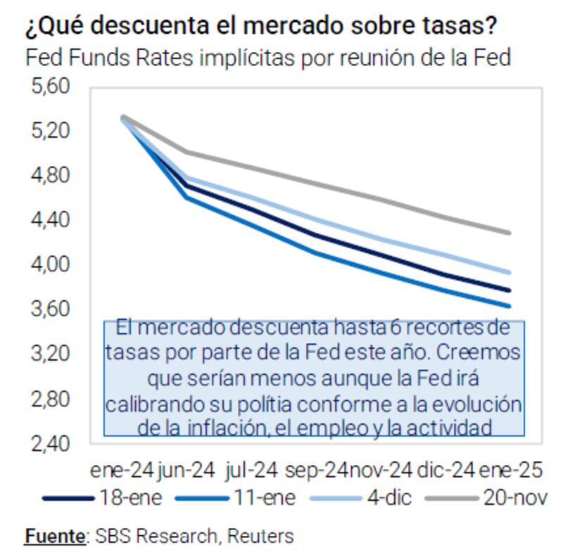 "Con el comienzo del nuevo año y habiéndose conocidos los datos de empleo e inflación, el mercado fue ajustando sus expectativas. La mediana de los participantes del FOMC de diciembre de 2023 proyectaba que en 2024 habría 3 bajas de tasas. Hoy el mercado ajustó desde al menos 6 bajas hasta al menos 5 bajas. El 31 de enero se llevará a cabo el próximo FOMC. Hasta entonces, es probable que el ajuste de expectativas continúe", detallaron.