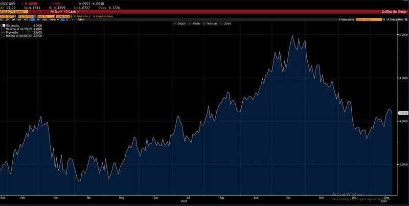 En las últimas jornadas, los inversores han recalibrado sus expectativas sobre las chances de que la Fed podría demorar hasta mayo en comenzar a bajar la tasa de interés, por lo que las tasas de los bonos del tesoro de EEUU se desplazaron al alza.