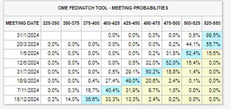 El mercado especula con un 99,5% de probabilidad que en enero, la Fed mantendrá sin cambios la tasa, y que hará lo mismo en marzo, con un 55,7% de probabilidad.