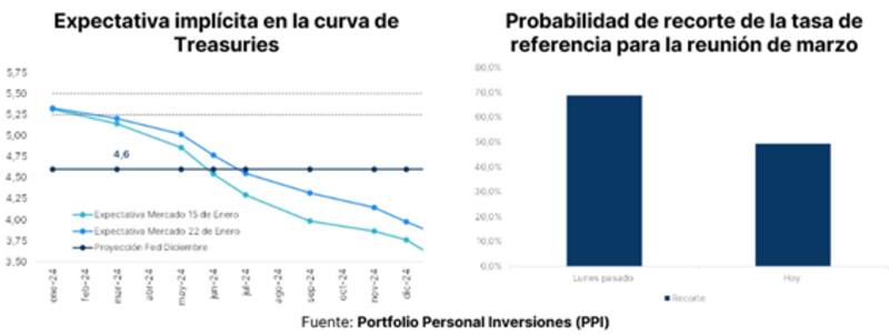 "Estos comentarios golpearon a las expectativas de los inversores, que venían muy optimistas previendo un recorte de tasas más rápido y más agresivo de los que marcaba la Fed. De hecho, en la última semana la probabilidad de recorte de 25 pb en la reunión de marzo bajó del 75% al 46% mientras que subió la probabilidad de dejar la tasa sin cambios y que sea recién en mayo el primer recorte", afirmó Polo.