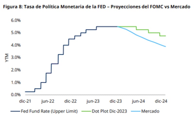"Pese a que podría haber recortes en la tasa de la Fed en 2024, el escenario descontado por el mercado (6 recortes) luce algo exagerado en un contexto en que adherimos al view de "higher for longer" en materia de tasas de la Fed", afirmó Franco.