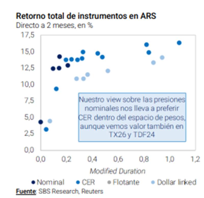 Por otro lado, y en línea con lo mencionado por los demás analistas, Franco afirmó que en base a las presiones nominales que percibe en la macro local, desde Grupo SBS prefieren la deuda CER dentro del espacio de la deuda en pesos, destacando los Tx26 y TDF24.