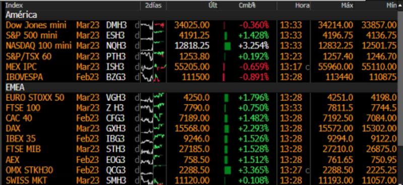 En Europa las acciones también operan al alza, con ganancias de 1,8% en el Stoxx50. La bolsa de Alemania sube 2,3%, seguido por la bolsa de España e Italia que ganan 1,5% cada una.