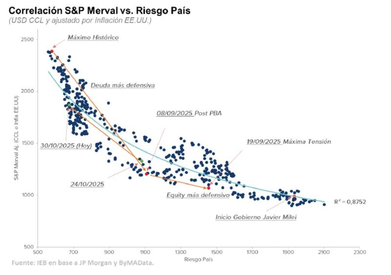 “Si analizamos la correlación entre el S&P Merval medido en dólares y los niveles de riesgo país asociados durante la gestión de Javier Milei, éste nos muestra a las acciones argentinas aún en niveles de subvaluación con respecto a la deuda soberana, motivo por el cual, creemos que aún queda potencial de suba para el equity”, dijeron.