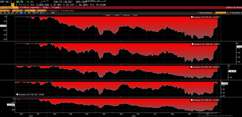Dentro del sector de Oil & Gas, YPF cotiza 20% debajo de sus máximos, mientras que Pampa opera 7% debajo de su pico máximo previo.