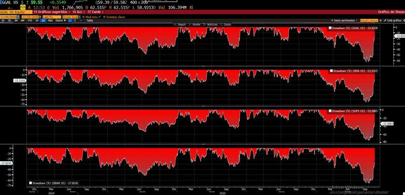 Las acciones de Grupo Financiero Galicia se ubican un 16% debajo de los máximos, mientras que Banco Macro se ubica un 21% debajo de dichos picos.