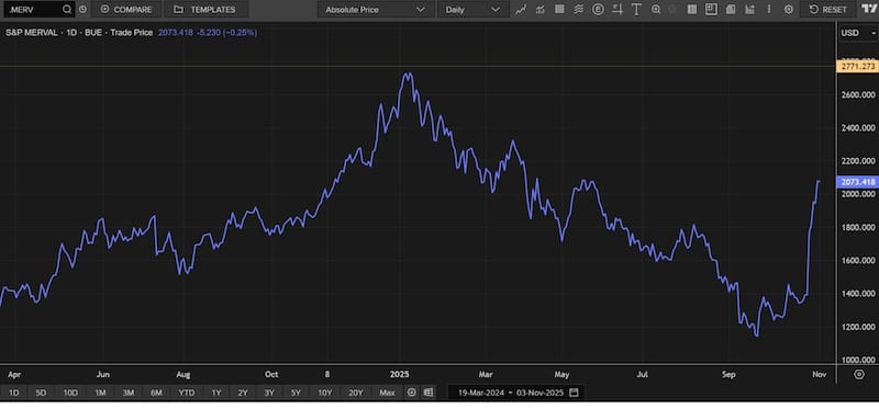 El índice bursátil argentino opera en u$s 2073, habiendo cotizado en u$s 1100 antes de las elecciones.