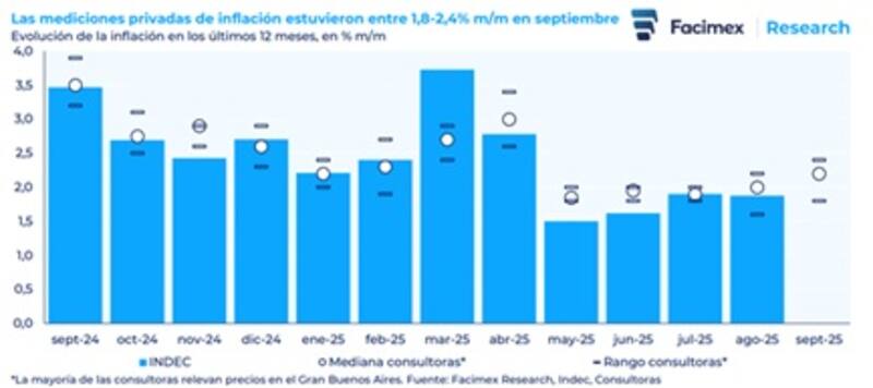 En resumen, las mediciones de las consultoras privadas estuvieron entre 1,8% mensual a 2,4% mensual, con una mediana del 2,2% mensual.