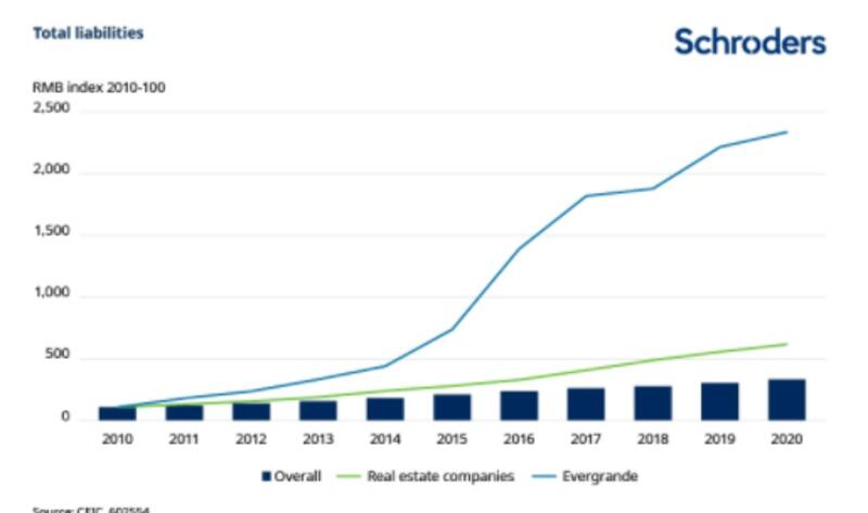 Tom Wilson, head of Emerging Market Equities de Schroders, explicó que la posición de endeudamiento de Evergrande se ha ido construyendo durante varios años y que el valor de la deuda de la compañía tomó un valor atípico y enorme en comparación con el sector inmobiliario en general.