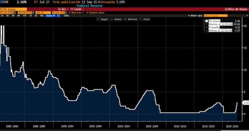 Con la intención de bajar la inflación, la Reserva Federal elevó por última vez la tasa de interés en su reunión de julio en 75 puntos básicos al rango de entre 2,25% y 2,5% y se espera que vuelva a subirla en septiembre.
