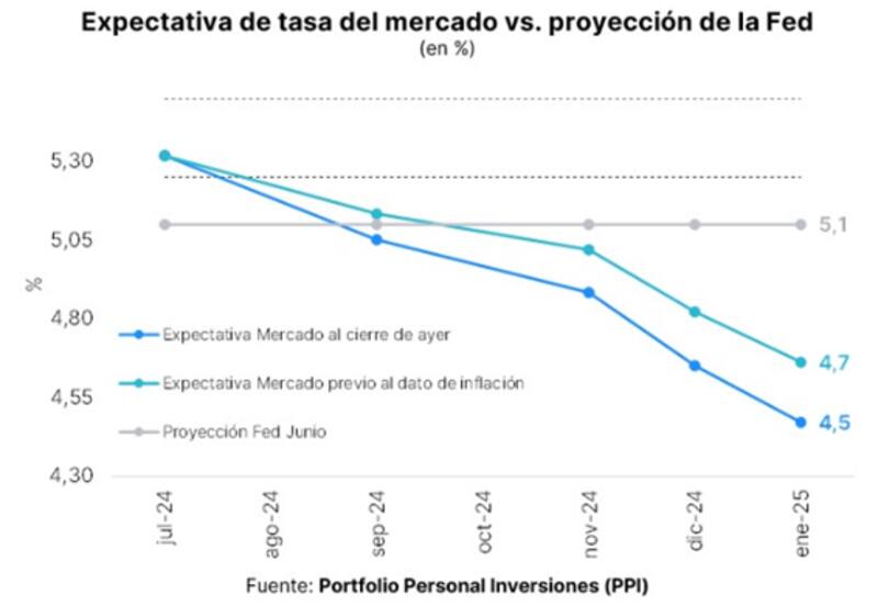 "El mercado descuenta casi en su totalidad que la primera baja se estará dando en septiembre, dejando sin modificaciones la tasa en esta reunión. Hacia fin de año estiman entre 2 y 3 bajas en total. Nuestra visión es que la Fed va a ser cauta y esperarían a tener algunos datos más que confirmen este sendero de la economía", señaló.