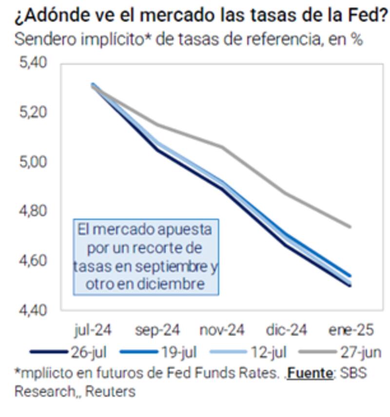 "Los mercados de futuros incorporan en los precios un escenario de 2.6 recortes de 25pbs en la tasa de política de la Fed, marcadamente por encima de los apenas uno que pronosticó la Reserva Federal en junio", dijeron.