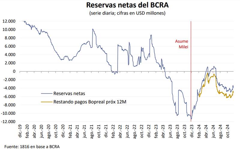 De acuerdo con cálculos privados, las reservas netas del Central se ubican en torno a u$s 9300 millones negativos, teniendo en cuenta los pagos de los Bopreal a doce meses y los depósitos del Tesoro que a principios de enero saldrán para pagarle a los bonistas. Sin esos dos compromisos, estarían rondando u$s 3000 millones negativos.