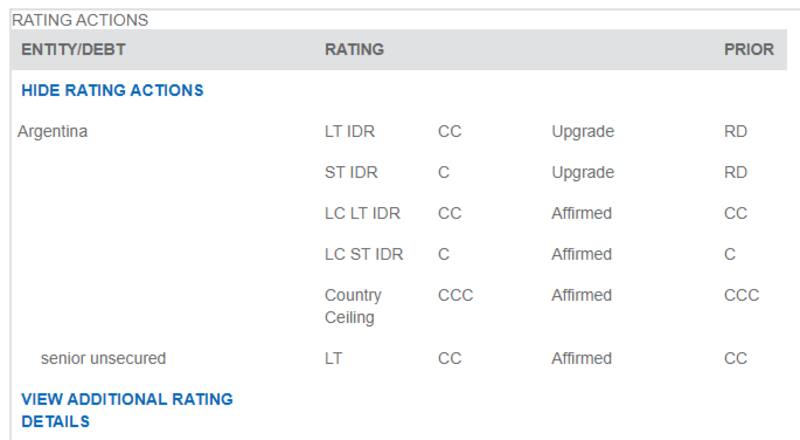 La agencia Fitch Ratings sacó hoy a la deuda soberana de Argentina de "default restringido" y la colocó en "CC", luego de que terminó una postergación unilateral del pago de letras del Tesoro (Letes).