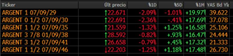 En el caso del tramo medio, la deuda a 2035 y 2038 muestra una baja de 1,3% y 0,8% respectivamente, mientras que los bonos a 2041 y 2046 descienden 0,79% y 1,25%.