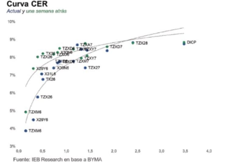 Hoy la curva CER opera con tasas de 5% en el tramo corto y de 7% en el tramo medio y largo, estos son niveles inferiores a los evidenciados hace una semana atrás.