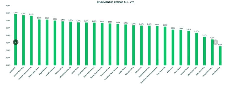 El fondo T+1 de Gainvest es el que mayores retornos acumulados en 2026 presemta, con una ganancia de 3,43%.