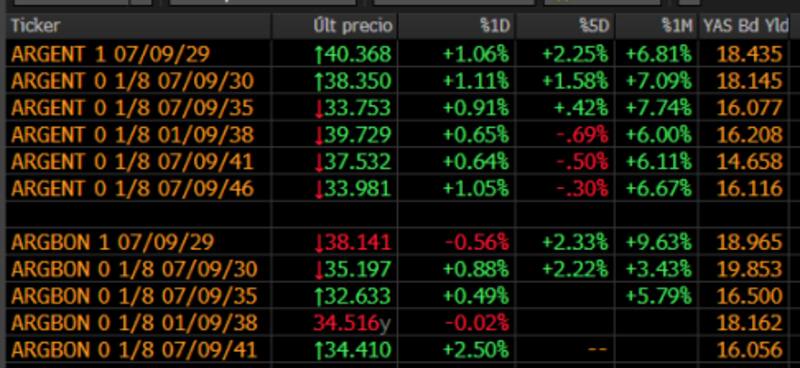 Entre los ley local hubo alguna caída (el AL29 bajó 0,56%) pero predominaron los incrementos. Las encabezó al AL41 (2,5%), seguido por el AL30 (0,88 por ciento).