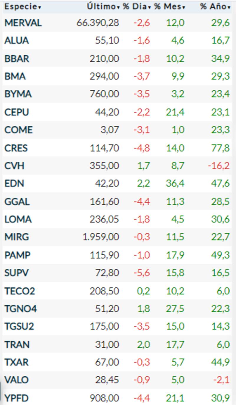La caída más acentuada la mostró Supervielle (5,6%), seguida por Cresud (4,8%), YPF (4,4%) y Banco Galicia (4,4 por ciento). Entre las pocas velas verdes, se destacó una suba de 2,2% de Edenor.