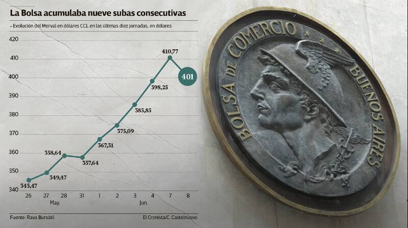 Ninguna suba es infinita y el Merval se encontró con un techo, luego de nueve jornadas consecutivas al alza: cayó 2,6% en pesos y cerró la rueda en 66.390,28 unidades. Medido en dólares contado con liquidación, el índice se ubicó en 401 dólares.