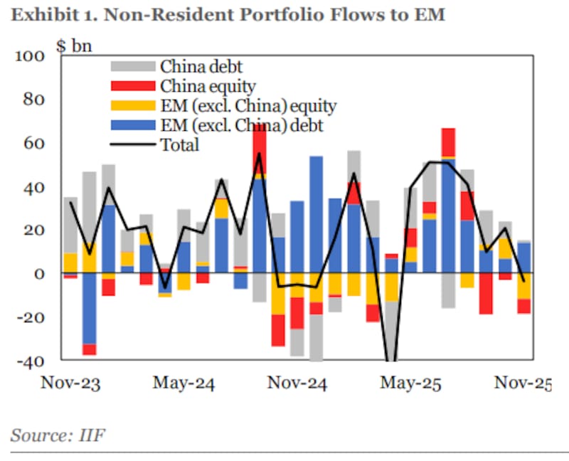 Los inversores redujeron exposición a equity emergente por u$s 18.900 millones, el mayor retiro mensual desde marzo de 2025, en un contexto de mayor aversión al riesgo global, repriceo de expectativas de tasas en economías desarrolladas y renovadas dudas sobre China. En contraste, la deuda mantuvo ingresos por u$s 15.000 millones, prácticamente en línea con octubre.