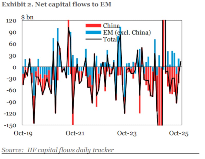 Noviembre mostró un giro claro en los flujos hacia mercados emergentes. El saldo mensual fue negativo, con una salida neta de u$s 3900 millones, luego del fuerte ingreso de octubre.