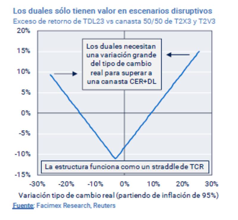 Debido a la estructura de los bonos duales, estos tendrán valor en contextos disruptivas tanto desde el lado cambiario como desde el lado inflacionario.