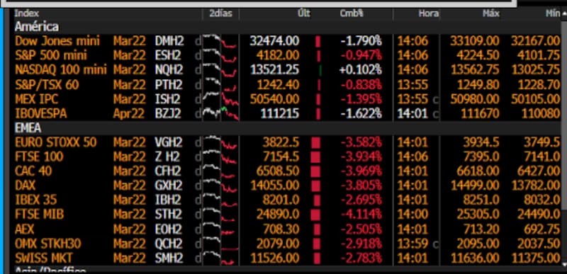 Las bolsas europeas cerraron con perdidas de 3,5% evidenciadas en el Stoxx50. El FTSE de Milán es el índice que más cae, con una baja del 4,1%, seguido por el FTSE100 de Londres, el CAC 40 de Francia y el DAX30 de Alemania que bajan entre 3,9% y 3,8%