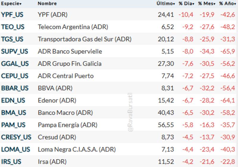 Las acciones de empresas argentinas que cotizan en Wall Street cayeron más de 10%, en línea con los demás activos argentinos que sufren una fuerte ola de ventas. En la plaza local, la tendencia fue similar: el S&P Merval cedió -4,9% y las peores bajas fueron para: Transportadora de Gas del Norte (-14,2%); Metrogas (-11,1%) y Transener (-10,5%).