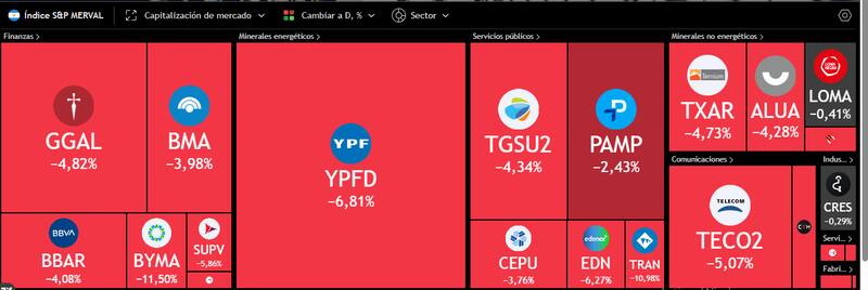 En Buenos Aires, las peores caídas son para: BYMA (-11,5%); Transportadora de Gas del Norte (-11,2%) y Transener (-10,4%).