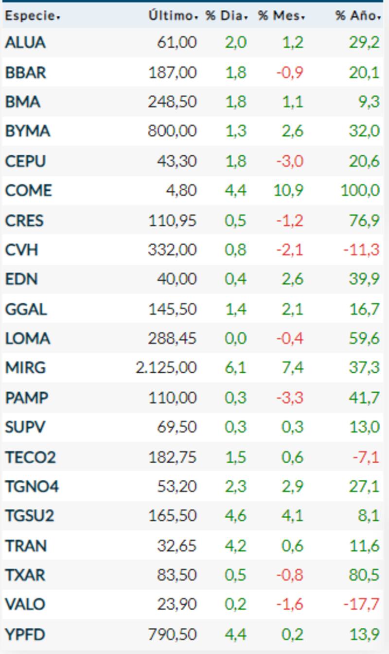 Todos los papeles del panel líder mostraron avances durante la rueda, aunque el principal de ellos quedó en manos de Mirgor (6,1%). Luego aparecieron Transportadora Gas del Sur (4,6%), YPF y Sociedad Comercial del Plata (4,4% ambas), YPF y Transener (4,2 por ciento).