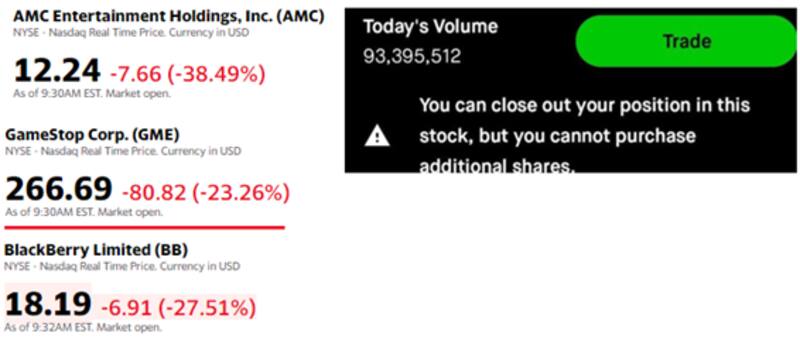 Las acciones que están en el centro de atención de Wall Street en los últimos días por el cierre masivo de posiciones cortas se encuentran en el ojo de la tormenta. Las principales plataformas bursátiles para minoristas se encuentran impidiendo su mayor exposición a dichas acciones y sólo permiten la venta de las posiciones actualmente en cartera de los inversores. Se desató una guerra entre inversores minoristas aglutinados en Redditt versus los fondos de inversiones.