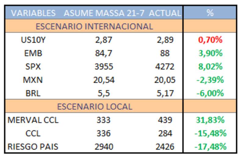 Es decir, la llegada de Sergio Massa al ejecutivo para ocuparse de la cartera económica generó un renovado entusiasmo en el mercado, lo cual permitió subas en los activos domésticos importantes.