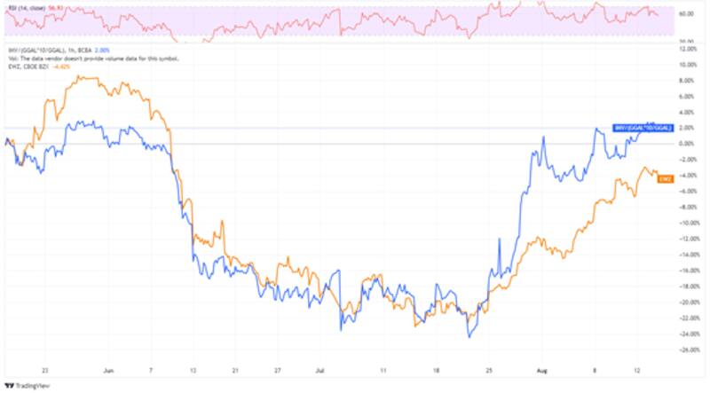 "En esta sintonía, si comparamos la performance del Merval medido en dólares, respecto del EWZ, ETF que replica el índice de Brasil, el movimiento es similar siendo el EWZ reflejó un incremento de casi 25% en el mismo periodo. Otra vez, se ve un mayor beta (sensibilidad) como el caso de renta fija", detalló.