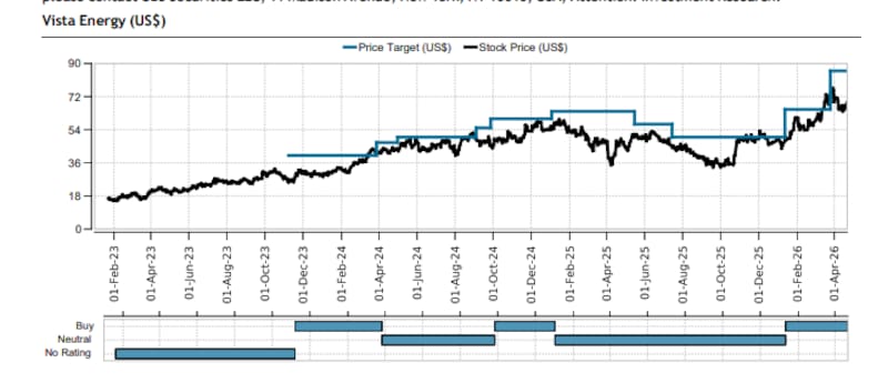 Goldman Sachs aborda la historia desde un ángulo más macro, pero llega a la misma conclusión. En su actualización de modelos para la temporada de resultados del primer trimestre, el banco destaca a Vista como una de sus tres preferencias relativas en el sector energético de América Latina, junto con Petrobras y PRIO.
